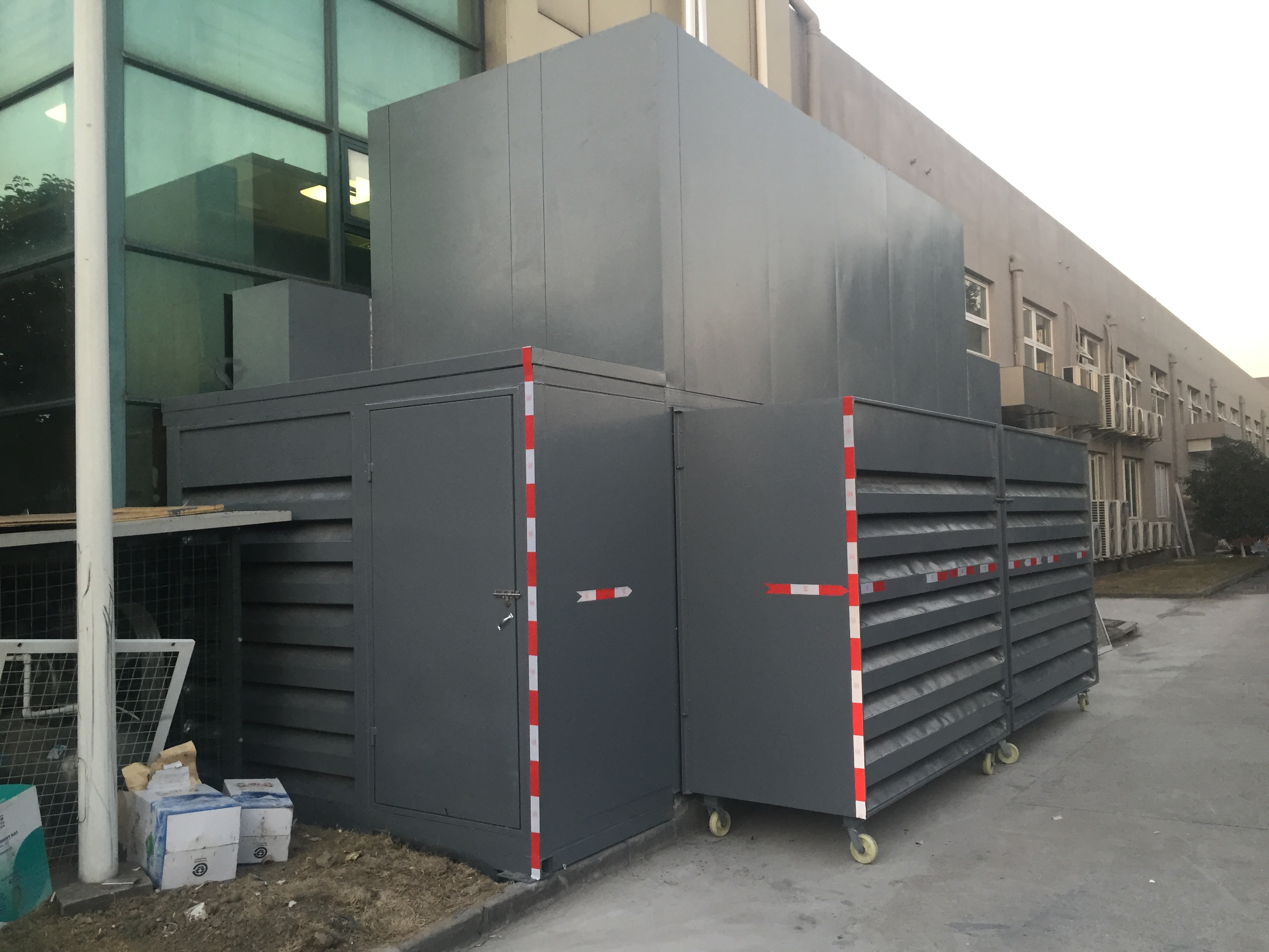 空(kōng)調外(wài)機整體降噪設施由出風消聲器、補風消聲器、進風消聲百葉及附屬(shǔ)檢修門組成。